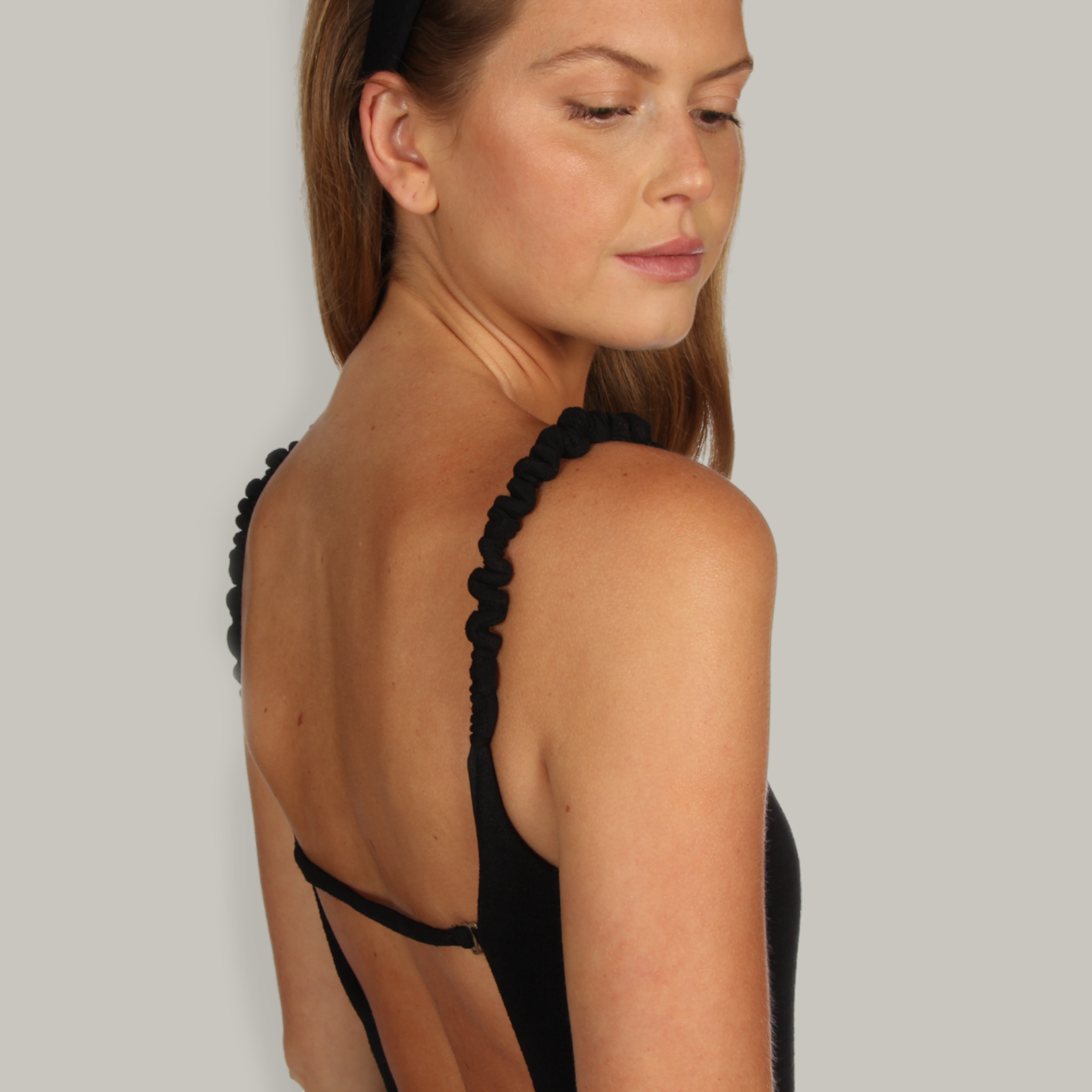 - O Maiô Frufru tem decote em U e alças tipo “spaguetti” franzidas em tipo frufru, É feito com nosso clássico bouclê