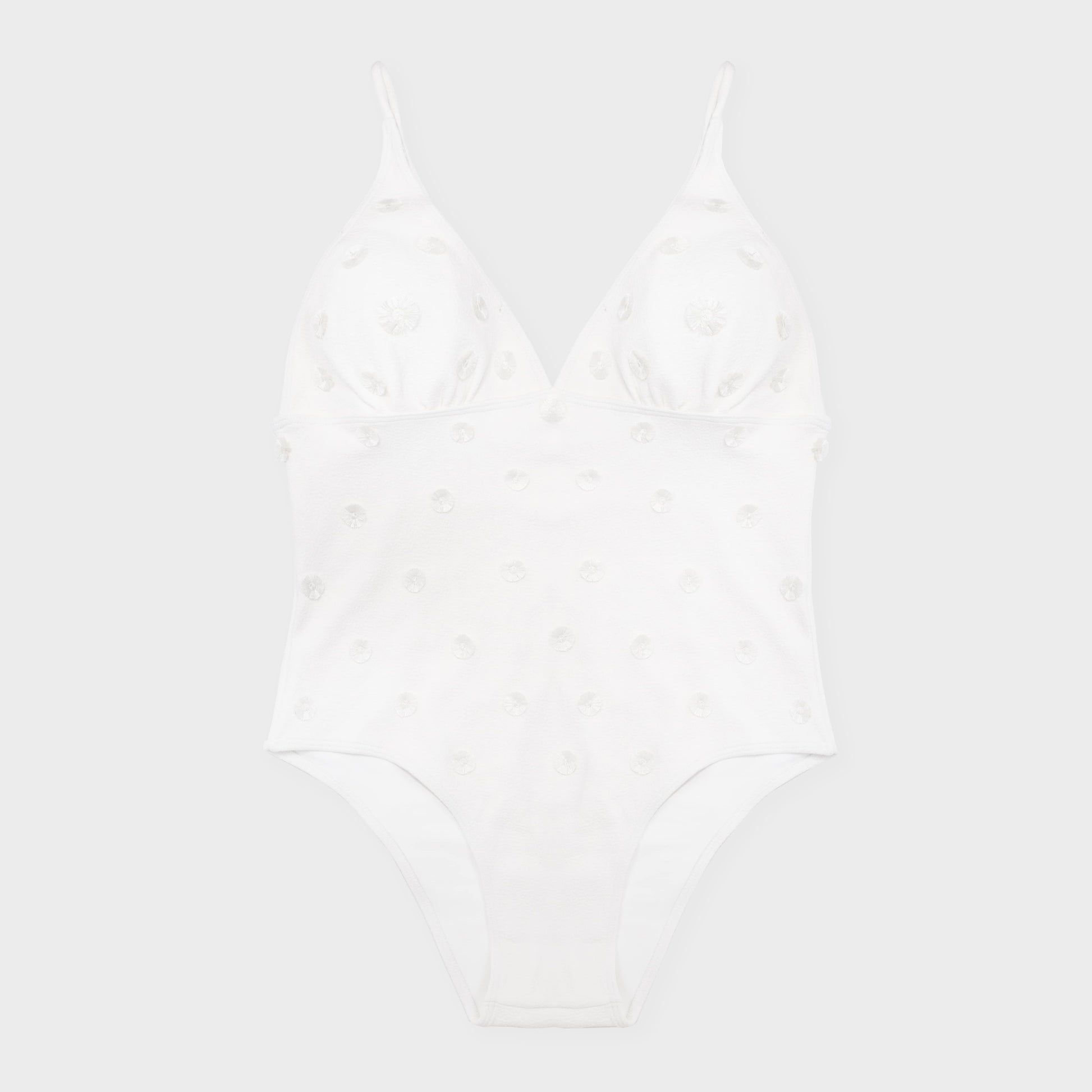 - O Maiô Sofia tem decote em V e alças tipo “spaguetti”, que podem ser ajustadas tanto nos ombros, quanto no pescoço, tipo frente única. É feito com nosso clássico bouclê e arrematado com a marca registrada da Bruna Malucelli, os pompons bordados à mão